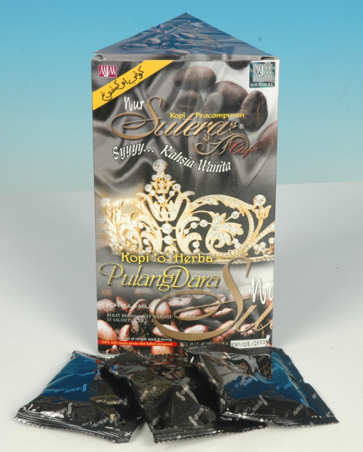 - Bancuhkan 1 sachet NUR SUTERA CAFE PULANG DARA + COLLOGEN 2500MG ke dalam 120ml air suam.